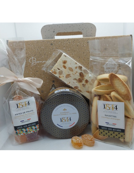 Nougats blanc de Provence Ingrédients :AMANDES de Provence torréfiées* 28%, Miel de lavande de Provence IGP 25%, Sirop de glucose, PISTACHE 2%, hostie (FECULE DE POMME DE TERRE 92%, EAU, HUILE VEGETALE), blancs d'OEUFS , arôme naturel de vanille